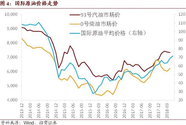 非食品价格环比由负转正为0.2%基本符合预期,国际油价的持续走高导致近期国内成品油价格自3月底已连续3次调升。