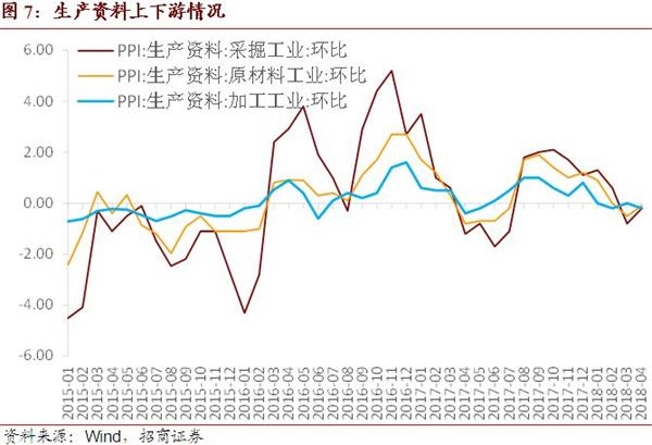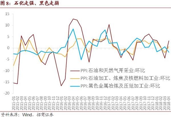 2、4月同比增速反弹0.3个百分点至3.4%完全符合我们的预测,原油价格的强势是主要支撑,PPI环比为-0.2%,黑色系是拖累。生产资料中,上游采掘与中游原材料工业环比跌幅收窄至-0.2%、-0.1%,下游加工工业环比涨幅转负为-0.2%。生活资料价格环比-0.1%。分行业来看,环比涨幅居前的行业包括石油和天然气开采业、石油加工炼焦及核燃料加工业,环比涨幅分别为3.2%、0.7%,环比跌幅居前的行业则包括黑色金属矿采选业、黑色金属冶炼及压延加工业、燃气生产和供应业,这依旧与基建、投资的低迷以及采暖季结束有关。