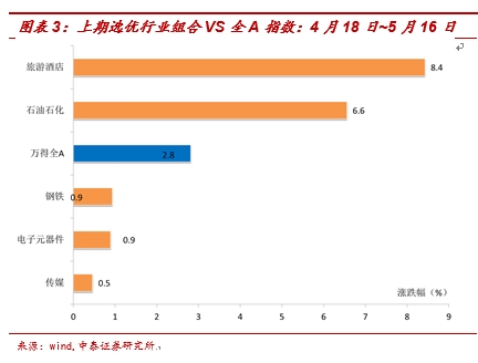 上期(4月18日)推荐的行业为医药生物、旅游酒店、食品、电子、传媒。截止5月16日,旅游酒店、石油石化两个行业跑赢基准——Wind全A指数,电子、传媒、钢铁跑输基准;组合平均超额收益率为0.6%。
