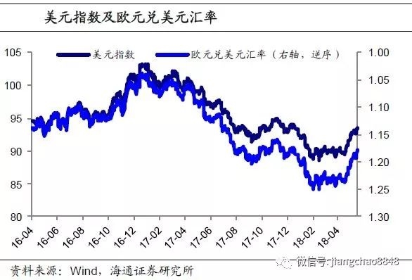 4月以来,伴随着美国通胀的回升和欧元区经济的低于预期,美元指数在经历了一年的低迷后重新强势回升。一方面,作为美联储最重视的物价指标,美国的核心PCE同比在3月份达到了1.9%,已十分接近2.0%的目标,通胀的回升支撑加息进程。而另一方面,欧元区1季度经济表现却逊于预期,使得欧元区退出宽松的猜想似乎再度远离。截至5月17日,欧元兑美元汇率从4月中旬的1.24跌至1.18,而美元指数则从89.6强势反弹到了93.5的年内新高。