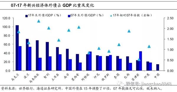 第二:内部债务激增,资产泡沫风险:17年末中国国内信贷/GDP超过220%,在新兴经济体中最高,其次是马来西亚、泰国和巴西,国内信贷/GDP都在100%以上。08年后国内信贷/GDP上升最多的是俄罗斯,其次是中国。过度宽松、提高债务,会加剧资产价格泡沫的风险。从资产价格增幅来看,2010到2017年的8年间,新兴经济体普遍经历了房价的大幅上涨,土耳其平均房价增长了160%,印度、马来西亚平均房价增长了100%左右,中国平均房价增长了70%,智利、印尼、泰国的房价涨幅也都在50%以上,而同一时期美国的全国仅上涨25%。当资产价格存在严重泡沫,美元又强势上行,新兴经济体将面临资本流出压力,一种后果是维持宽松政策、但汇率大幅贬值,另一种后果是货币被迫收紧、刺破资产价格泡沫。