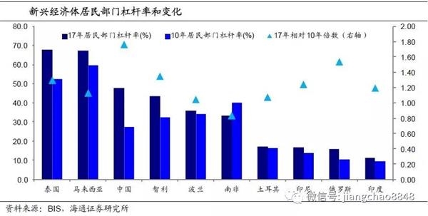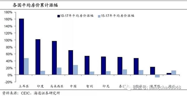 从资产价格的增幅来看,2010到2017年的8年间,新兴经济体普遍经历了房价的大幅上涨,其中,土耳其全国的平均房价增长了160%,印度、马来西亚的平均房价都增长了100%左右,中国的平均房价增长了70%,此外,智利、印尼、泰国的房价涨幅也都在50%以上,而同一时期美国的全国房价指数仅上涨了25%,因而这些新兴经济体国家的资产泡沫风险值得重视。