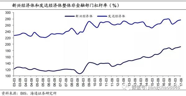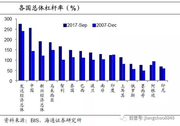 经过08年金融危机以来企业、政府、居民的三轮举债,我国负债/GDP代表的总体杠杆率已经明显高于其他新兴经济体。根据BIS的统计,截至17年3季度我国的非金融部门总体杠杆率超过250%,距离发达经济体280%的整体杠杆水平已不远。而与07年末相比,我国的总体杠杆率也是增长最快的,说明在08年后的弱美元周期中,我国也经历了债务规模的高增。