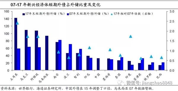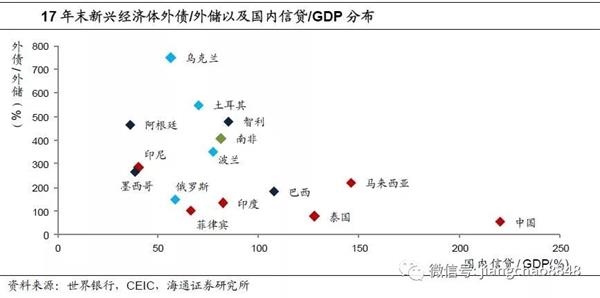 分部门来看,17年末阿根廷、乌克兰、南非、印尼、波兰、墨西哥、土耳其政府部门的外债已超过外储余额,其中,阿根廷和墨西哥的政府部门外债中分别有8%和10%是短期外债,对应政府短期外债占外储的比重约23%和12%,阿根廷的潜在风险更大。而土耳其、乌克兰的政府外债几乎都是长期债券,高额外债下更需关注的是其企业的偿债能力。