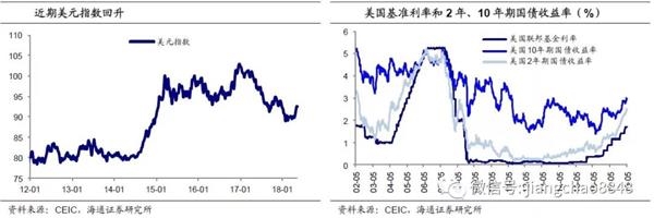 虽然此次美元重新反弹才持续了1个月左右,但不少新兴经济体的汇率却已感受到了压力。随着美国持续加息,而港币市场仍低,3月底美元兑港币汇率首次触及了7.85的弱方兑换保证线,促使香港金管局入市购买港元,以维系联系汇率制度。而到了4月,伴随着美元指数的强势反弹,阿根廷、土耳其的汇率先后出现大幅贬值,截至5月17日,阿根廷比索、土耳其里拉对美元的汇率相对4月初已分别贬值17%和11%,俄罗斯、巴西、墨西哥货币相对美元贬值了7%以上,都已超过了这期间美元指数升值的幅度(4%)。