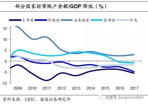 其次,在国际收支方面,土耳其、阿根廷近年经常账户余额恶化,也将进一步加重外债偿付的负担。土耳其经常账户差额/GDP在15-16年一度收窄至-3.8%,但到17年却再度扩大至-5.6%,阿根廷的经常账户逆差恶化更加严重,经常账户差额/GDP在15-16年为-2.7%左右,但17年扩大至-4.9%,因此,土耳其和阿根廷的偿债负担进一步加重。而亚洲国家中,印尼和菲律宾经常项目转为逆差、马来西亚顺差降低,同样增加了脆弱性。相反,巴西、乌克兰、南非、智利等国近年经常账户逆差有所收窄,有助于减轻国际收支和外债压力。