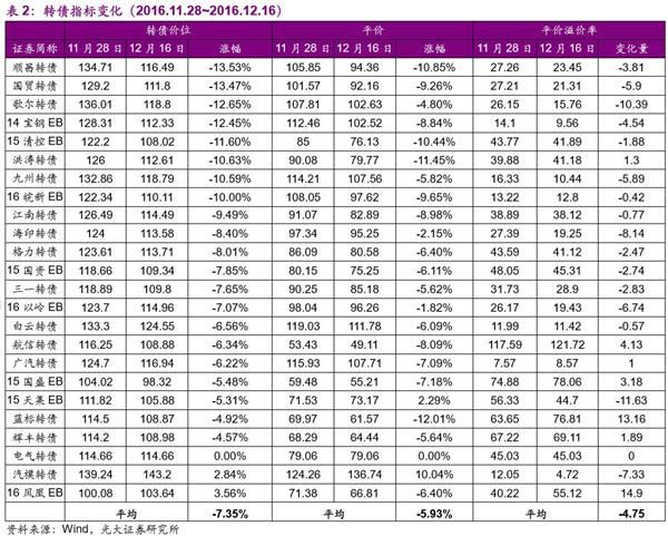 2016年11月28日至12月16日,转债平价平均跌幅为5.93%,转债价格平均跌幅为7.35%。与2013年情况一致,高平价转债跌幅依旧居前,且估值压缩也最为明显。在本次下跌中,转债杀估值的特征明显,平价溢价率平均被压缩了4.75个百分点,仅航信、广汽、蓝标、辉丰、国盛、凤凰、洪涛7只转债估值得到了不同程度的扩张。