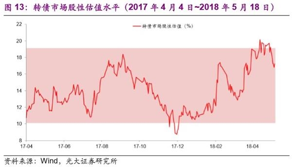 估值——本周转债市场估值继续下跌,转债股性估值由5月11日的17.26%下跌至5月18日的16.09%,当前市场估值尚处高位。