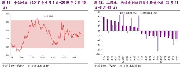 价位——中证转债报收295.59点,周下跌0.35%;国债指数报收164.35点,周上涨0.06%。其中约一半转债上涨,天马(5.68%)、鼎信(4.88%)、万信(4.36%)等涨幅位列前列。其余略有下跌,雨虹(-3.60%)、崇达(-3.39%)、康泰(-3.02%)等跌幅位列前列。从个券调整幅度来看,转债个券上涨幅度与板块、行业整体调整幅度相对应。