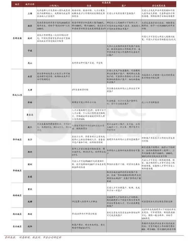 本轮“抢人大战”是从西安、南京、武汉等城市蔓延至北京、上海等一线城市。2017年3月,西安出台了“史上最宽松户籍政策”,6月将本科以上学历落户年龄放宽至45岁,2018年相继推出四次户籍政策升级,简化落户程序。杭州(2017年4月)、武汉(2017年6月)、南京(2017年7月)等多个二线城市也陆续出台了人才吸引政策。四个一线城市深圳(2017年7月)、广州(2017年10月)、北京(2018年3月)和上海(2018年3月)也推出了各自的新政,争夺目标人才。