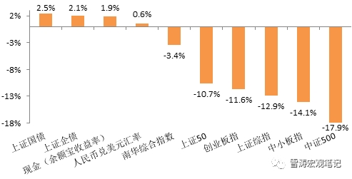 年初至今,大类资产排序表现最好的是债券,也是唯一正回报的资产,商品表现略好于股票,股票整体负收益,还有明显的结构分化。年初时,市场普遍认为今年上半年股票比债券更有机会,事实证明宽货币(利好债和成长股)和紧信用(利空信用债和周期股)的落地时点和推进力度都超出了市场预期。大类资产的整体表现,反映出宏观经济进入到了商业周期的后周期,“债>商>股”的排序反映出商业周期正位于滞胀和衰退的临界象限。
