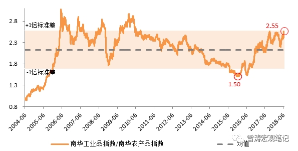 | 图4:南华工业品指数比农产品指数位于均值以上1个标准差 |