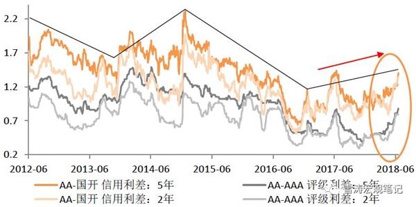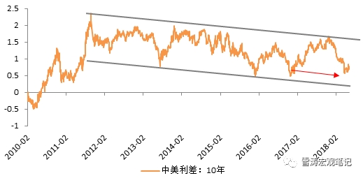 对利率下行空间的制约主要来自于中美利差。从近年的情况来看,中美10年期国债利差的下限在50bp附近,分别在2015年底、2016年底和今年4月触及,因此在技术面上对利率下限形成一定支撑。从基本面出发,可以将中美利差分解为:政策利率差+核心通胀差+期限溢价差+主权风险溢价。下半年,中美之间:政策利率差收窄(美联储加息)、核心通胀差收窄(美国经济周期赶顶、中国经济周期回落)、期限溢价差走扩(美债平坦化、国债陡峭化)、主权风险溢价微升(汇率微贬),所以中美利差的下限有小幅收窄的空间,10年期国债收益率的底部在3.5%左右。