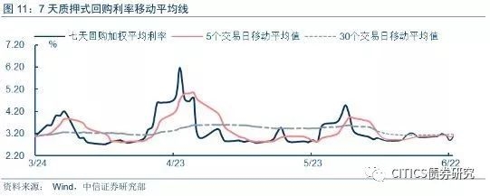 从7天回购的K线图中可以看出,上周(6月15日-6月22日)回购利率短暂上升后下降,从上上周五的3.03%上升至上周二的3.07%,周三上涨至3.20%,周四再下降到3.10%,周五下降到2.92%。