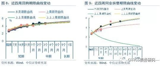 从回购曲线来看,上周短期利率上升,长期利率上升,期限曲线呈变陡峭。从同业拆借期限结构来看,7天拆借利率下行,较长期限的拆借利率上升,期限曲线变陡峭。