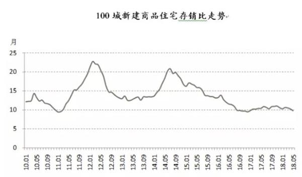 杨红旭表示2018年5月份,100个城市新建商品住宅存销比即库存去化周期为9.8个月,这也意味着市场仅需9.8个月的时间就能消化完这些库存,该数值相比4月份10.3个月有所下滑。