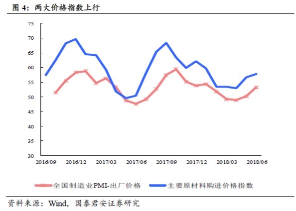 主要原材料购进价格指数连升两个月,出厂价格指数为今年高点(图4)。6月主要原材料购进价格指数、出厂价格指数分别为57.7%、53.3%,高于上月1.0个百分点、0.1个百分点。其中,黑色金属冶炼及压延加工业的主要原材料购进价格指数和出厂价格指数涨幅扩大,升至70.0%以上。这也与高频数据相印证。6月螺纹钢、动力煤价格先升后降,但整体呈现上涨态势;水泥价格小幅下降,但仍处历史相对高位。原格在OPEC增产不及预期、伊朗遭美国制裁、美原油库存下降远超预期等多重因素的影响下先降后大幅上涨。商务部大宗商品价格指数环比增速有所下降,但同比增速大幅上涨。
