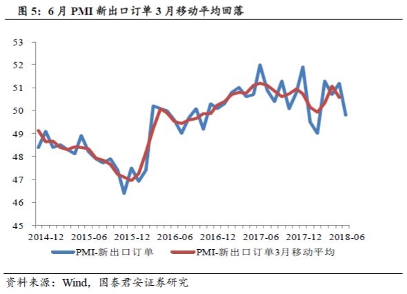 从趋势来看6月PMI新出口订单3月移动平均回落(图5)。6月份新出口订单指数为49.8%,比上月下降1.4个百分点。进口指数为50.0%,低于上月0.9个百分点。从外围经济来看,企业对政治不确定性的担忧导致欧元区6月制造业PMI降至十八个月最低。