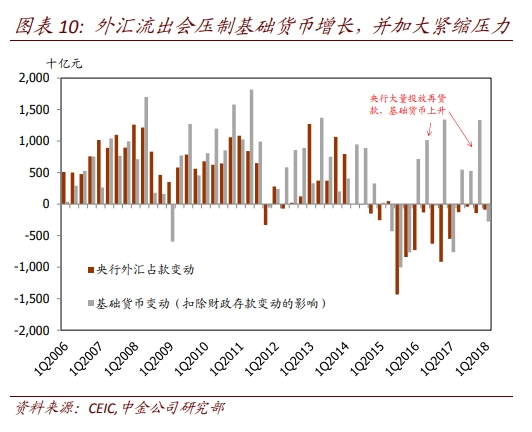 政策调整的方向包括进一步降准、采取更具可操作性的金融去杠杆路径以保证实体经济融资需求;对非标回表和地方政府隐性债务的清理也需安排过渡期及调整对“个案”的容忍度。此外,考虑到中美最近经贸摩擦升级,更稳健的内需走势也将有助于提升市场对中国金融资产的风险偏好。而另一方面,如果政策调整滞后、市场持续波动,紧缩压力可能进一步加剧,而人民币汇率预期也可能继续走弱。在这样较悲观的情形下,外汇流出会压制基础货币扩张,形成紧缩负反馈,并在很大程度上增加目前货币政策调整的复杂性。这一方面,2015-2016年的经历是前车之鉴。