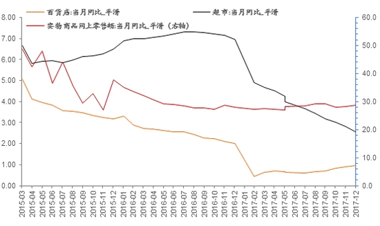 实物商品网购增速与超市、百货销售额增速