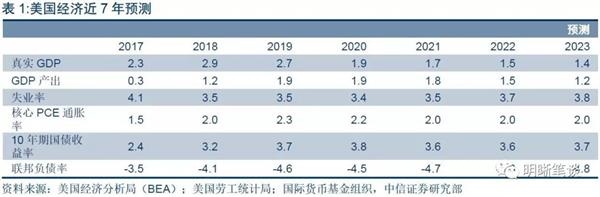 长期来看,美国经济面对若干威胁(T)。当下美国经济强劲,然而这样的增长速度可能无法持续。首先,特朗普实施的税改法案虽然在这两年那会提振美国经济,然而税改也可能推升美国年度联邦预算至1万亿美元。降息、增支和减税虽然是美国政府应对经济萎缩的三板斧,但是税改法案拉升美国年度联邦赤字将极大降低美国财政灵活性。税改还会加剧年度预算方面的角力,未来重建军事力量和基础建造等其他优先事项可能会成为牺牲品。根据国际组织6月14日公布的《United States of America: Staff Concluding Statement of the 2018 Article IV Mission》一文,文中从财政政策,货币政策,税收政策,贸易政策,金融系统等角度分析了美国经济未来的潜在威胁。该文中预测美国实际GDP增速从2019年起开始回落,到2023年实际GDP最终回落到1.4。