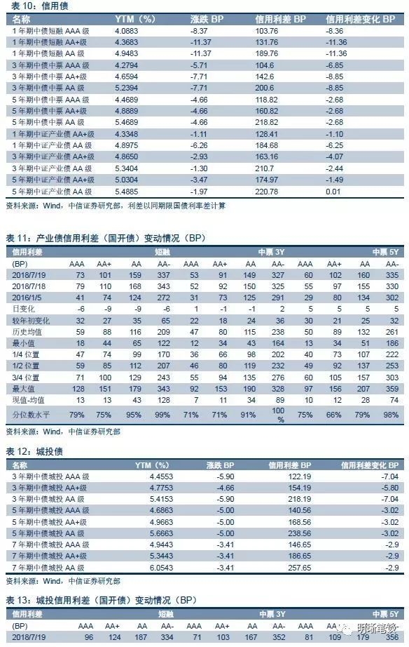 7月19日,债券收益率长、中、短端全面下行。其中AAA中票1Y下行8BP,3Y下行6BP,5Y下行5BP;AA中票1Y下行11BP、3Y下行8BP、5Y下行5BP;AA-中票1Y下行8BP、3Y下行5BP、5Y下行5BP。