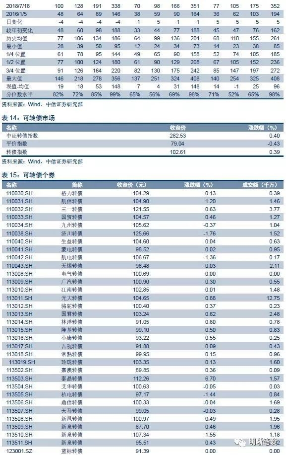 7月19日转债市场,平价指数收于79.04点,下跌0.43%,转债指数收于102.61点,上涨0.39%。74支上市可交易转债,除铁汉转债、电气转债停牌外,51支上涨,21支下跌。其中泰晶转债(0.07%)、洪涛转债(0.02%)、雨虹转债(0.02%)领涨, 康泰转债(-0.08%)、济川转债(-0.02%)、星源转债(-0.02%)领跌。74支正股,除铁汉生态、上海电气停牌,双环传动、天康生物、海印股份横牌外,17支上涨,52支下跌。其中,泰晶科技(0.10%)、航天信息(0.03%)、东方雨虹(0.03%)领涨,康泰生物(-0.10%)、中航电子(-0.05%)、众信旅游(-0.05%)领跌。