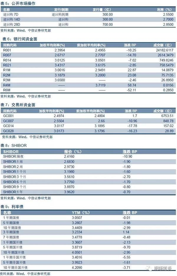 【流动性动态监测】我们对市场流动性情况进行跟踪,观测2017年开年来至今流动性的“投与收”。增量方面,我们根据逆回购、SLF、MLF等央行公开市场操作、国库现金定存等规模计算总投放量;减量方面,我们根据2018年3月对比2016年12月M0累计增加4388.8亿元,外汇占款累计下降4473.2亿元、财政存款累计增加5562.4亿元,粗略估计通过居民取现、外占下降和税收流失的流动性,并考虑公开市场操作到期情况,计算每日流动性减少总量。同时,我们对公开市场操作到期情况进行监控。