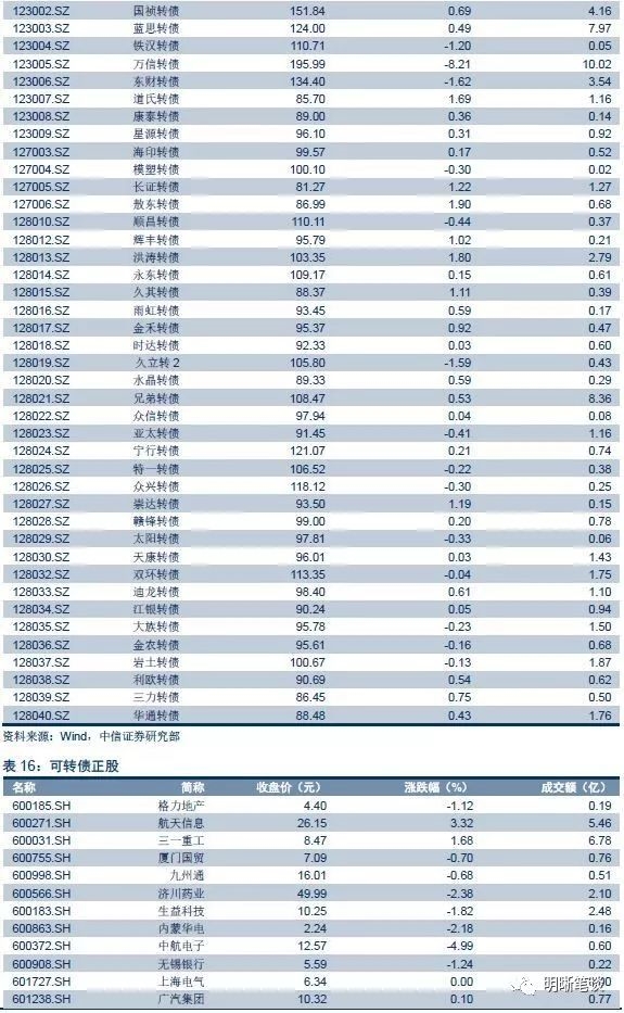 本周四沪深两市同向变动,尾盘上证综指下跌0.53%,下跌0.52%。上周转债市场受益于正股回调录得小幅涨幅,弹性充足个券走势抢眼,强者恒强的逻辑仍在上周转债市场受益于正股回调录得小幅涨幅,弹性充足个券走势抢眼,强者恒强的逻辑仍在延续。上周我们曾明确提示对转债市场多一份乐观,市场表现也基本符合我们的预期。不可否认市场整体弹性仍未处于最佳位置,从近期个券层面表现出发也能发现唯有少数低溢价率标的充分享受正股反弹录得不俗收益,多数弹性不佳标的涨幅并不具有充足吸引力,我们判断此核心逻辑在短期内依旧延续。本周我们想要引入新的思考,即一致预期对于转债市场的参考价值。就上周而言,我们观察到多数机构对股市由空转多,情绪偏向乐观,而后续市场表现也印证了投资者情绪的边际改善,正股市场的变化直接拉动了转债表现。我们从背后逻辑来阐明。之前基础研究系列已经说明相较正股转债向上空间有限对beta敏感性更高,因而一致预期更具参考意义,当市场达成一致时情绪定有方向性变化,此时转债市场对其更为敏感。特别是对于传统的固定收益投资者而言,其多偏向风险厌恶型,一致预期可作为辅助性指标对市场情绪进行把握。操作层面我们认为可以自上而下把握股票以及债券市场内生情绪的变化,若股市出现边际改善时,转债标的有望双重受益于正股反弹以及溢价率走扩从而赚取超额收益。落实到具体策略层面,短期来看市场情绪仍处于上升通道中趋势有望维持。具体标的建议关注东财转债、三一转债、国祯转债、济川转债、千禾转债、崇达转债、星源转债、双环转债、天马转债、新泉转债以及流动性较好的银行转债。