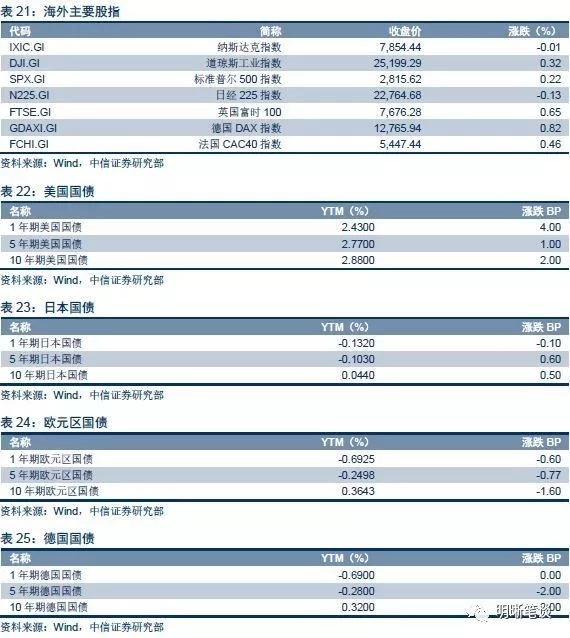 2018年7月19日,银银间质押回购加权利率涨跌互现,隔夜、7天、14天、21天、1个月分别变动了-9.73BP、-3.09BP、-7.04BP、-17.7BP、11.1BP至2.38%、2.63%、2.89%、2.98%、3.00%。当日国债收益全面下跌,1年期、3年期、5年期、10年期国债分别变动-0.01BP、-2.52BP、-1.98BP、-2.99BP至3.05%、3.21%、3.28%、3.44%。