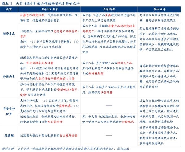 第一,过渡期内业务整改的监管要求显著放松,充分考虑目前经济与金融体系面临的内外部压力,有助于避免由于监管压力集中释放导致的金融市场风险和经济下行风险。此次配套细则集中下发,分层次作用于短期和长期行业的调整和重塑: