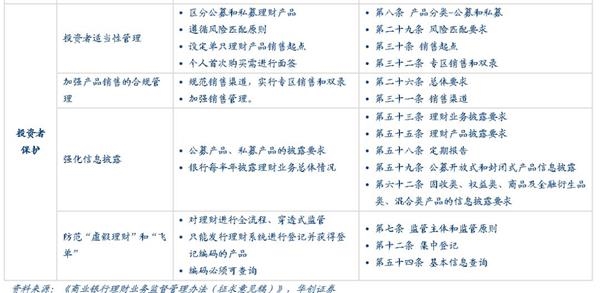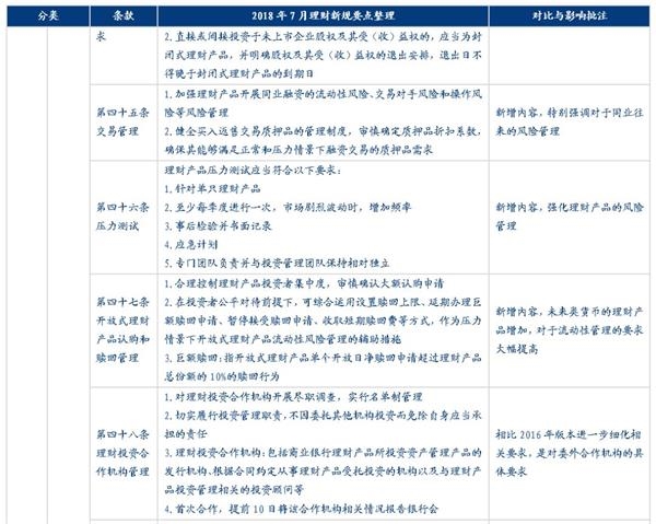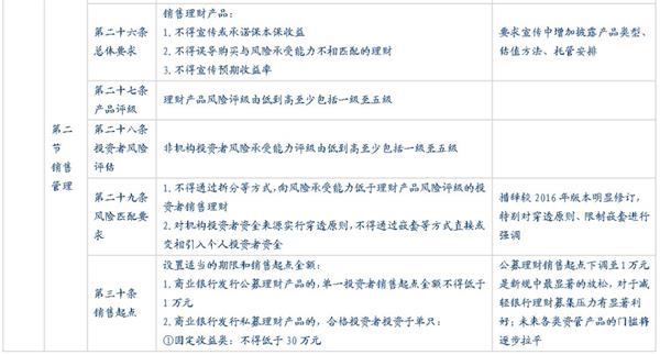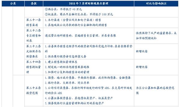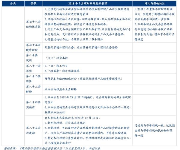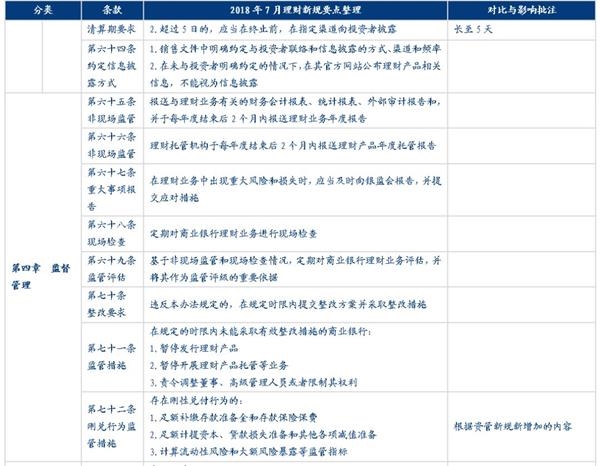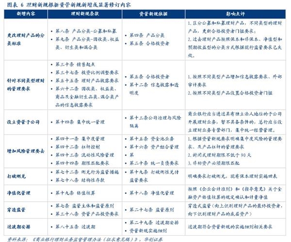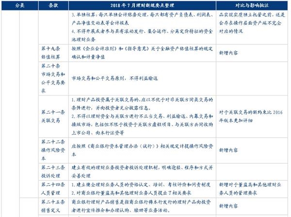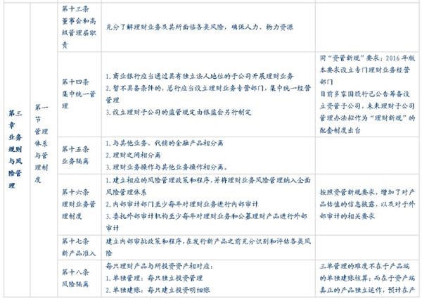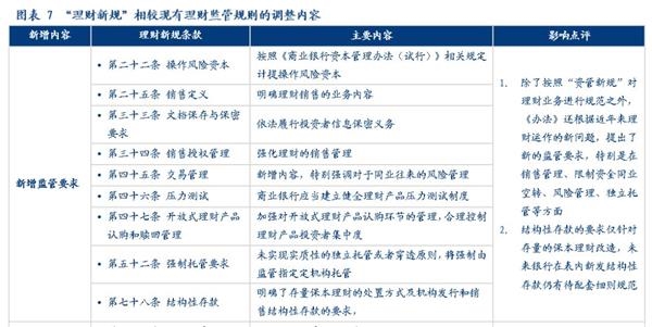 “理财新规”发布之后,原多项针对理财产品经营、销售、投资、风险管理相关的文件将废除,除了根据“资管新规”做出的相应调整和增加的内容之外,新版的理财管理办法也在现有理财业务监管的基础上根据当前的市场环境做了许多调整,包括新增对于销售管理、风险管理、独立托管等方面的监管规则;提高对于关联交易、投资限制及负面清单、集中度管理、流动性风险管理、监管处罚等方面的监管要求、放松了对于销售门槛的起点、私募理财产品杠杆比例、产品清算时限等方面的监管要求,还有一些则保持原有要求不变,例如市场最为关注的对非标投资的总比例约束等内容。