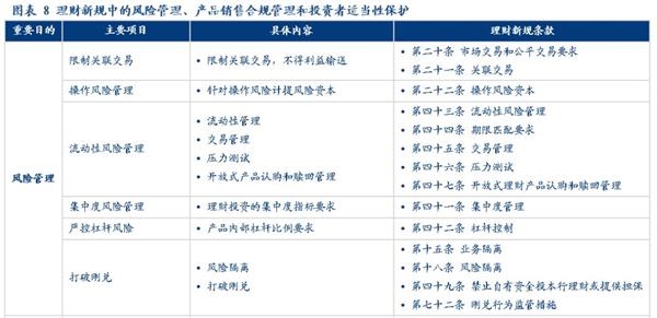 通读《办法》可以发现其中对于风险的把控更加全面与完备,包括对于操作风险、流动性风险、集中度风险、销售风险、杠杆率控制、集中度管理、信息披露等方面的着力程度明显提升,此外,《办法》在投资者保护方面也做出了更多的具体要求,这主要是在银行理财打破刚兑的发展过程中,无论是投资者还是理财发行人都将面临极大的转变,只有通过严格的风险把控和投资者适当性管理,才能减少在理财发展过程中的道德风险和逆向选择,同时帮助投资者在有效识别自身风险偏好之前不会做出非理性选择。