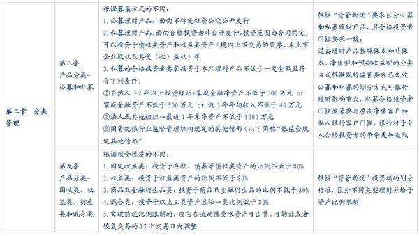 新版“理财新规”与“资管新规”保持高度一致,特别的在文件中出现了更多过去没有的针对理财的监管要求,包括理财产品的分类方式、进行集中度和杠杆的控制、设立鼓励的理财资管子公司、进行产品估值的披露和外部审计、过渡期安排等。