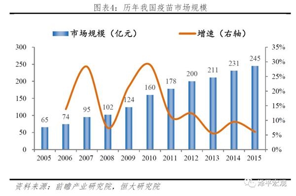 总量方面,我国是世界上最大的疫苗生产国,共有45家疫苗生产企业,可生产63种疫苗,预防34种传染病,是世界上为数不多的能够依靠自身能力解决全部计划免疫疫苗的国家之一。2015年我国疫苗产业市场规模从2005年的65亿元增至245亿元,年均复合增长率达14%。