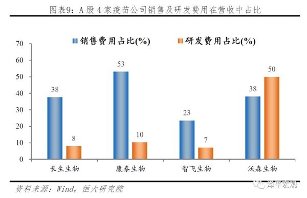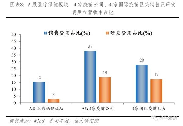 A股医疗保健板块共有290家公司,其中4家以疫苗为主业。数据显示,2017年A股医疗保健板块总销售费用达1772亿元,占总营业收入的15%,其中14家超过50%;4家疫苗公司总销售费用达18亿元,占营业收入38%;4家国际疫苗巨头(辉瑞、默沙东、赛诺菲、GSK)总销售费用占比28%。反观研发费用,A股医疗保健板块总研发费用319亿元,占总营业收入的2.8%;4家疫苗公司除沃森生物外,研发费用占比均未超过10%;4家国际疫苗巨头总研发费用占比17%。