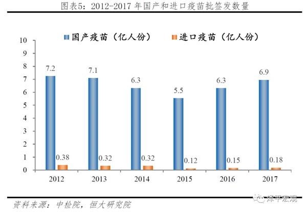 市场结构方面,《2017年生物制品批签发年报》显示,我国每年批签发疫苗约5-10亿人份,其中国产疫苗占据绝大部分份额,进口疫苗仅占5%以下。