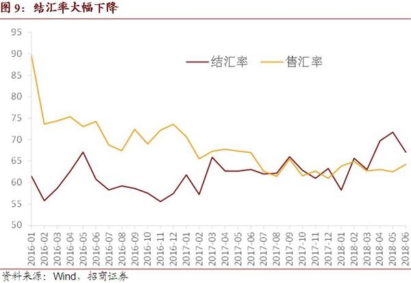 分项目来看,经常项目顺差大幅下降1019亿元至146亿元,考虑到6月贸易差额事实上是环比扩大的,经常项目结售汇项出现如此剧烈的恶化,原因无疑是来自于境内主体结售汇意愿的变化。资本与金融项目顺差327亿元,大于经常项目顺差,也相较5月份进一步扩大,资本与金融项目成为稳定我国外汇供求形势的主要原因。远期净售汇887亿元,同样出现明显恶化,相较5月大幅恶化993亿元。