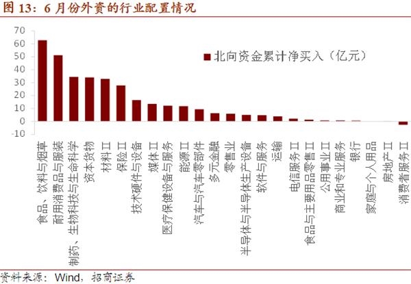 从6月份外资的行业配置情况来看,食品饮料、耐用消费品与服装、医药成为最受外资青睐的行业。