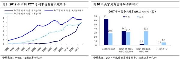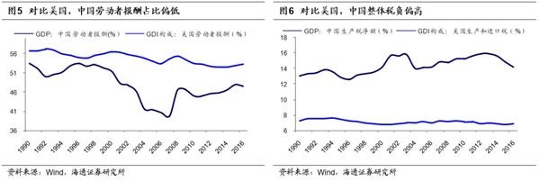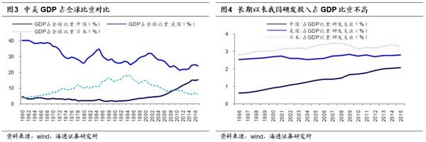 我国实体经济大而不强。前述微观现象表明中国500强企业多而不精,回到宏观背景,可发现我国实体经济也面临大而不强的窘境。2010年我国GDP总量一举超过日本,成为仅次美国的第二大经济体,当时我国GDP总量为41.3万亿元,达美国GDP的41%,而2017年我国GDP总量为82.7万亿元,达美国GDP的63%,中美GDP总量差距正在缩小。从全球GDP占比看,我国GDP占比从2010年的9.2%升至2017年的15.2%,而同期美国从22.6%升至24.0%,日本从8.6%降至6.0%,从GDP总量看中美确为世界超级大国。但是,从更细致的经济指标看,我国实体经济可谓大而不强。第一,我国人均GDP排名靠后。根据世界组织统计,2017年全球人均GDP为10728美元,我国人均GDP为8643美元,位列第71名,美国人均GDP达到59501美元,位列第7名,日本人均GDP为38440美元,位列第23名。第二,我国劳动者报酬偏低,整体税负偏重。一般GDI和GDP相差不多,两者差值在国民收支表中列为统计误差,在此从中国GDP和美国GDI构成看,2016年我国劳动者报酬占比为47.5%,而美国为53.2%,我国企业营业盈余占比为24.6%,而美国为24.7%,我国生产税净额占比为14.2%,而美国为6.9%。另外,从广义宏观税负(/GDP)看,2017年中国为20.9%,而美国为17.3%,可见整体而言我国税负较重。第三,我国研发投入占GDP比重不高。近些年我国研发支出占GDP比重逐步提升,从1996年的0.6%升至2015年的2.07%,但与世界主要大国仍有些差距,如2015年美国为2.79%,日本为3.28%。