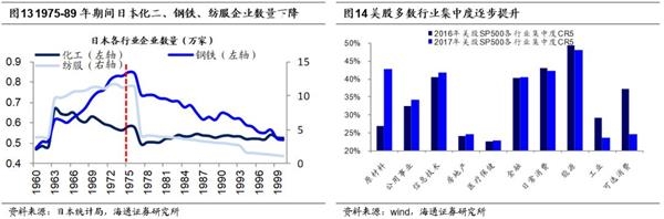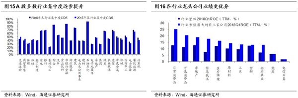 行业内部集中度提升,特别是传统类将更快实现这一过程。借鉴美日经验,在产业结构转型期间,传统周期行业规模收缩,并且行业集中度也迎来快速提升,而新兴行业逐步长大变强,行业集中度会逐步提高。在1970-80s年代期间日本也迎来产业结构转型升级期,传统行业集中度快速提升,这可以从当时大量的并购重组得到佐证。1970s年代石油危机导致日本大批企业倒闭,国内“救济式并购”开始兴起,随着日本企业不断并购重组,日本各行业企业数量逐步下降,如化工从1975年的0.58万家降至1989年的0.53万家,钢铁从0.85万家降至0.61万家,纺服从11.41万家降至3.11万家,各行业集中度逐渐提高。统计过去两年美股标普500公司,发现信息技术和医疗保健等新兴行业市值最大的前5家公司2017年营收占比均较2016年提升,可见在产业结构转型后期新兴产业行业集中度也会逐步提升。统计过去两年A股中信一级行业分类公司数据,发现大部分行业前五家公司2017年营收占比均高于2016年,特别是交通运输、钢铁、轻工、基础化工等周期性行业集中度显著上升,而餐饮旅游、计算机、医药等尚无此趋势。在多数行业集中度提升的背景下,龙头公司市场份额扩张,业绩有望继续改善。A股财报也显示龙头基本面更优异,比如信息技术行业前三大龙头/行业18Q1ROE(TTM)为17.7%/7.2%,金融为12.8%/12.2%,电信业务为1.5%/1.6%,为18.7%/12.5%,为12.7%/6.8%,医药保健为16.1%/11.9%,原材料为14.1%/10.0%,能源为5.5%/5.7%,工业为13.2%/9.3%,日常消费品为25.0%/12.5%,可选消费为20.3%/10.9%。