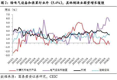 (1)制造业时薪增速缓慢,分行业中仅电气设备和装置时薪增长显著高于平均水平,其他分行业薪资增长偏低,原料金属、计算机和电子产品行业薪资增长尤其低迷。