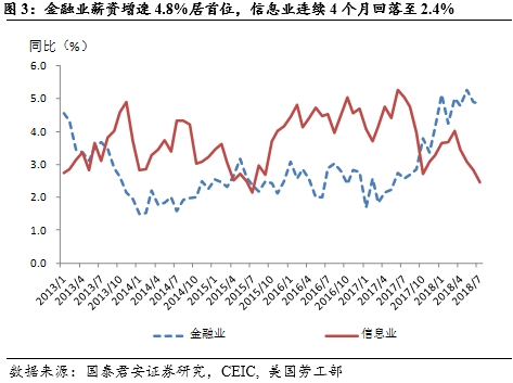 (2)服务业中,金融业薪资增速仍居首位,公共事业薪资增长加速,休闲和酒店服务业延续6月较快增长,此前增速较快的信息业回落至均值之下。