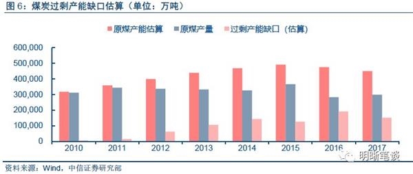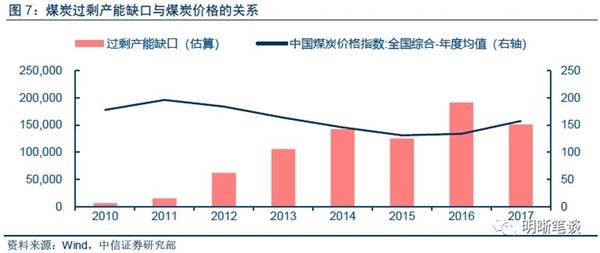 近2年煤炭行业去产能的效果显现。在十三届全国人大一次会议记者会上,国家发展和改革委员会主任何立峰透露,煤炭2017年化解2.5亿吨,2016年化解2.9亿吨,两年时间累计化解5.4亿吨。2018年的《政府工作报告》提出,2018年要再退出煤炭产能1.5亿吨左右。根据上述数据,我们估算了国内煤炭产能的变化,同时,根据各年煤炭的实际产量,可以算出国内煤炭产能过剩程度的缺口,见图6。