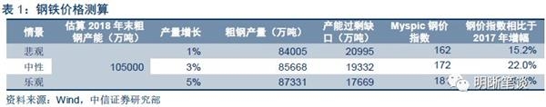 2018年钢铁需求与钢价上行的情景分析。今年政府工作报告提出减钢铁产能3000万吨,而去年粗钢产能为108000万吨,所以可以估算2018年末粗钢产能将为105000万吨。假设在悲观、中性以及乐观背景下,今年全年钢铁产量相比于2017年分别增长1%、3%及5%,对应的钢铁产量分别为84005万吨、85668万吨以及87331万吨,依据钢铁产能、钢铁产量以及产能过剩缺口之间的关系,可以得到三种情境下产能过剩缺口分别为20995万吨、19332万吨以及17669万吨。再依据前文中提到的钢铁产能过剩缺口和钢铁价格之间的关系,可以求得三种情境下Myspic钢价指数,分别为162、172以及181。,相比于2017年分别增长15.2%、22%以及28.6%。