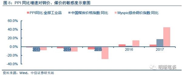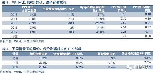 依据2013年至2017年的数据,求得每年PPI同比与煤价同比、钢价同比的比值,再求得五年的平均值,其中PPI同比与煤价同比比值平均为0.77,PPI同比与钢价同比比值平均为0.23。