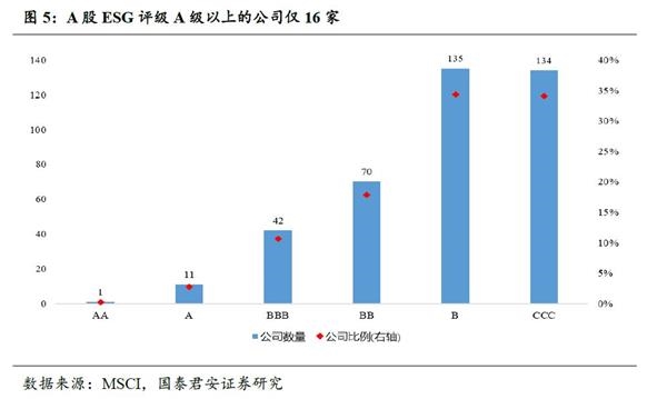 中国公司ESG评级刚刚起步,上市公司ESG评级表现欠佳。2018年,MSCI开始对A股上市公司的ESG表现进行评级。目前,AA级公司仅有1家,A级公司11家,共占参评公司的3.05%。B级和CCC级的公司分别有135家和134家,共占68.45%。ESG表现优秀的A股公司较为稀缺,普遍集中于BBB及以下。
