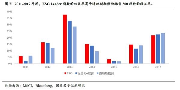 ESG选股策略为投资者创造更高的收益率。与道琼斯指数和标500指数相比,ESG Leader指数具有稳定的超额收益。2011-2017年间,ESG Leader指数的收益率高于道琼斯指数和标普500指数的收益率。以2011年作为基年,2011-2017年间,ESG指数投资的累计收益率为114.99%(复利收益率为182.23%),标普500指数为100.85%(复利收益率为146.67%),道琼斯指数为95.77%(复利收益率为140.41%)。