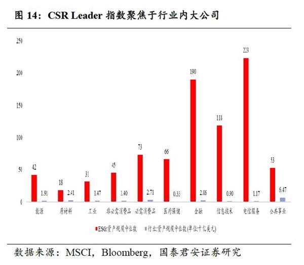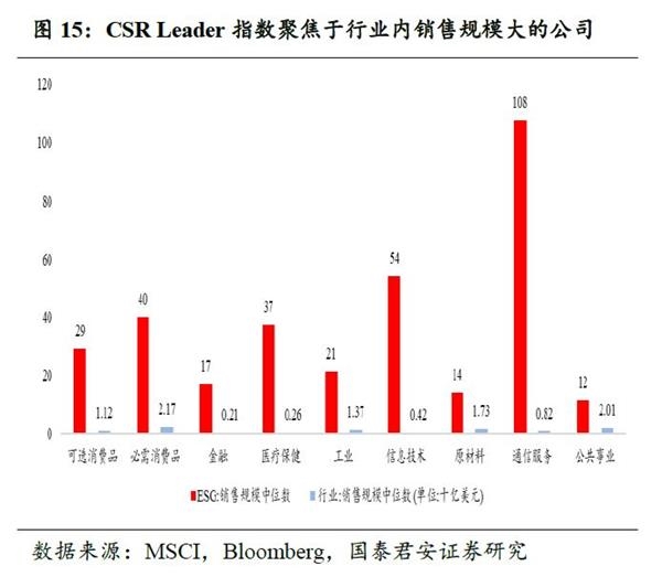 投资于行业龙头公司。ESG表现亦被视为公司质量的信号,以克服“柠檬市场”问题:优质的公司通过ESG的建设,将企业理念与公司治理向利益相关者传导,降低企业运营过程中的冲突。以资产规模和销售规模作为企业行业竞争力的测度维度,可以发现ESG Leader指数更加倾向于行业的龙头公司。