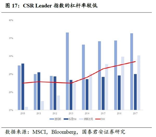 投资于低经营杠杆的公司。ESG策略往往被贴上低风险偏好的标签,企业通过风险控制手段,提高可持续运营的概率。在以往研究中,低风险偏好的公司表现为低杠杆与销售低波动率。2010-2013年间,ESG Leader指数的杠杆率低于道琼斯指数和标普500指数,2014-2017年间,ESG Leader指数的杠杆率低于道琼斯指数和纳斯达克指数,并且8年间,ESG Leader指数的杠杆变化区间显著小于纳斯达与道琼斯指数。